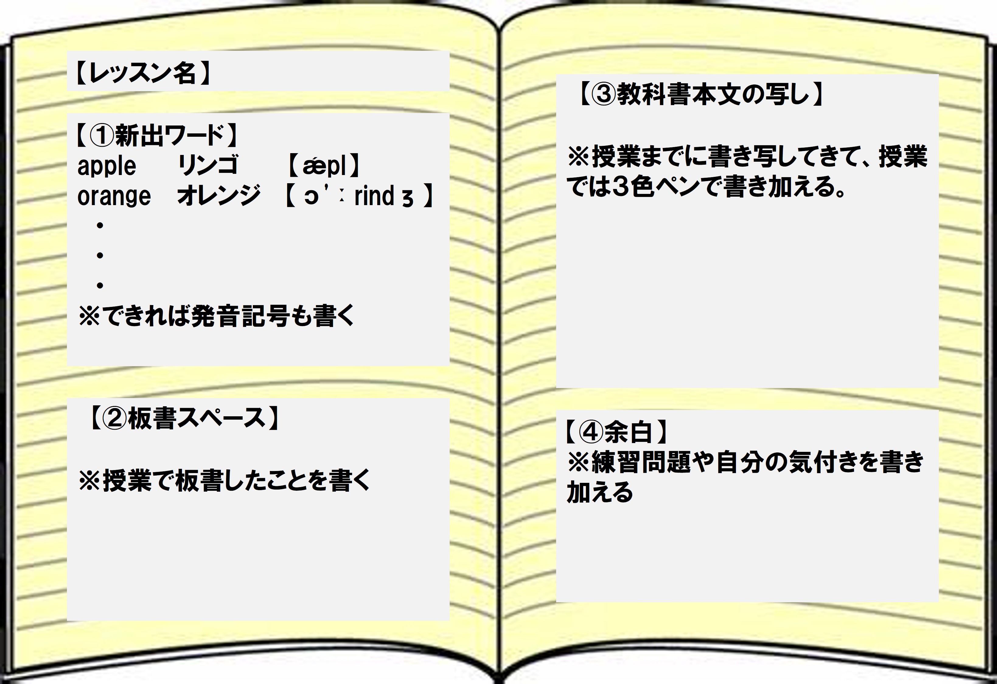英語のノートでは、下の図のように見開き1ページをレッスン1つ分として、ノートを4つのパーツに分解することがおすすめです。